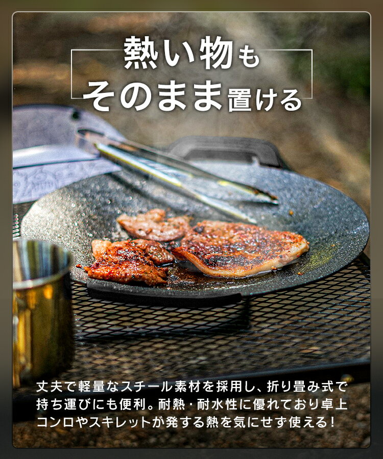 水や熱に強い!熱々のスキレットもそのまま置ける! 水や熱に強いスチール製のフルメッシュ天板を採用! スチールメッシュ天板は、耐熱温度180℃!調理後の熱いスキレットやダッチオーブン、バーベキューコンロなどをそのままドカッと置けます。