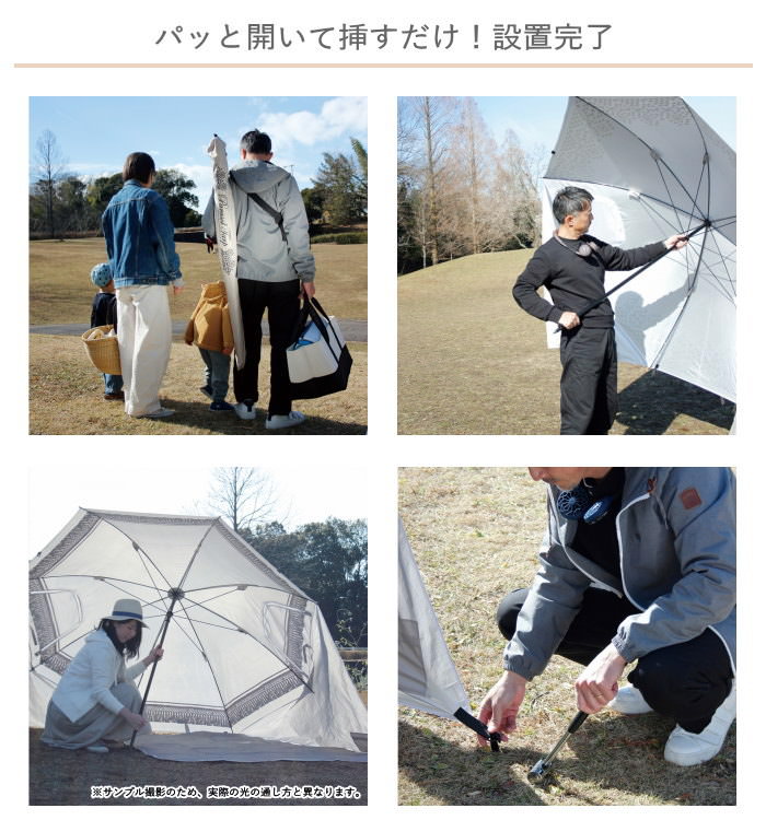 傘のようにパッと開くだけの簡単おしゃれタープ ・Spec 商品名 パラソルタープ 素材 傘:ポリエステル100%(遮光率 98.8%、UV CUT率97.8%) サイズ 使用時サイズ:約w195×d102×h168cm 収納時サイズ:約h135×φ8cm 重さ:約3000g 備考 付属品: ペグ8本、ロープ3本、サイドシート用ロープ1本、収納袋 ハンマーは付属しません。