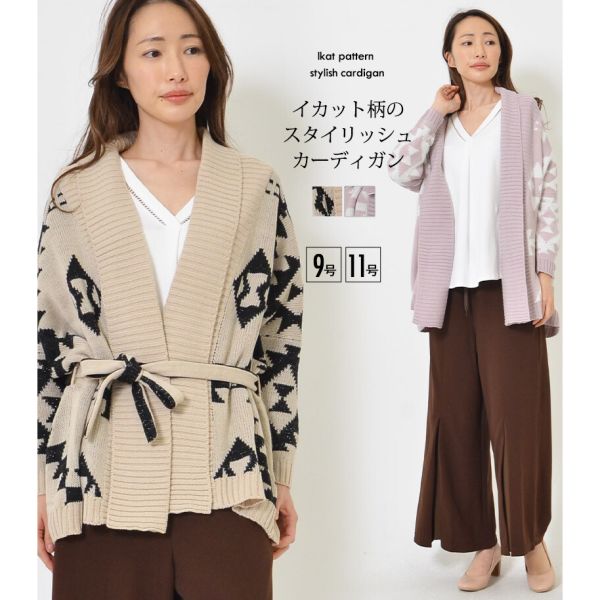 カーデ 9号 11号 レディース ニット 長そで ワイドシルエット イカット柄 共布ベルト ボタンなし 長め丈 [キャンセル・変更・返品不可]