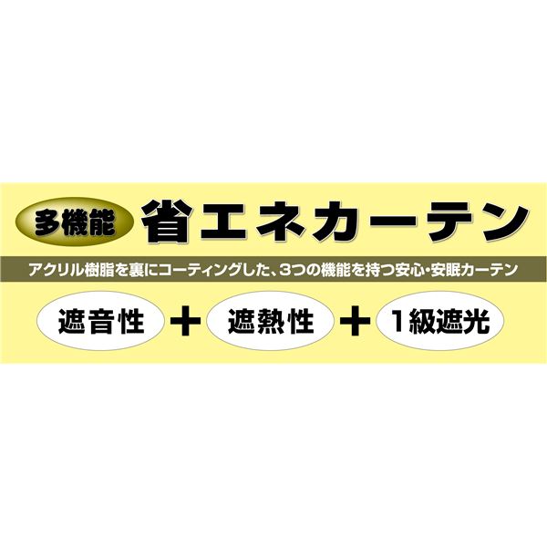 ■多機能省エネカーテンアクリル樹脂を裏にコーティング3つの機能を持ち、安心・安眠できるカーテン 1.遮音機能 2.遮熱機能 3.1級遮光■1級遮光で光をシャットアウト・1級/遮光率99.99%以上 人の顔の表情が識別できないレベル・2級/遮光率99.80%以上、99.99%未満 人の顔あるいは表情がわかるレベル・3級/遮光率99.40%以上、99.80%未満 人の顔の表情はわかるが事務作業には暗いレベル■安心・快適なポイント・洗濯機で丸洗い可能 ※洗濯表示に従ってください。