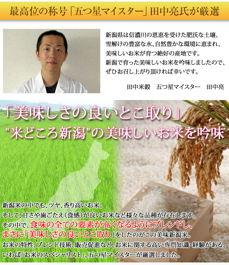 今回はお米のプロ・五つ星お米マイスターが""米どころ新潟""の美味しいお米を厳選しブレンドしました!!新潟米の中でもツヤ、香り高いお米。